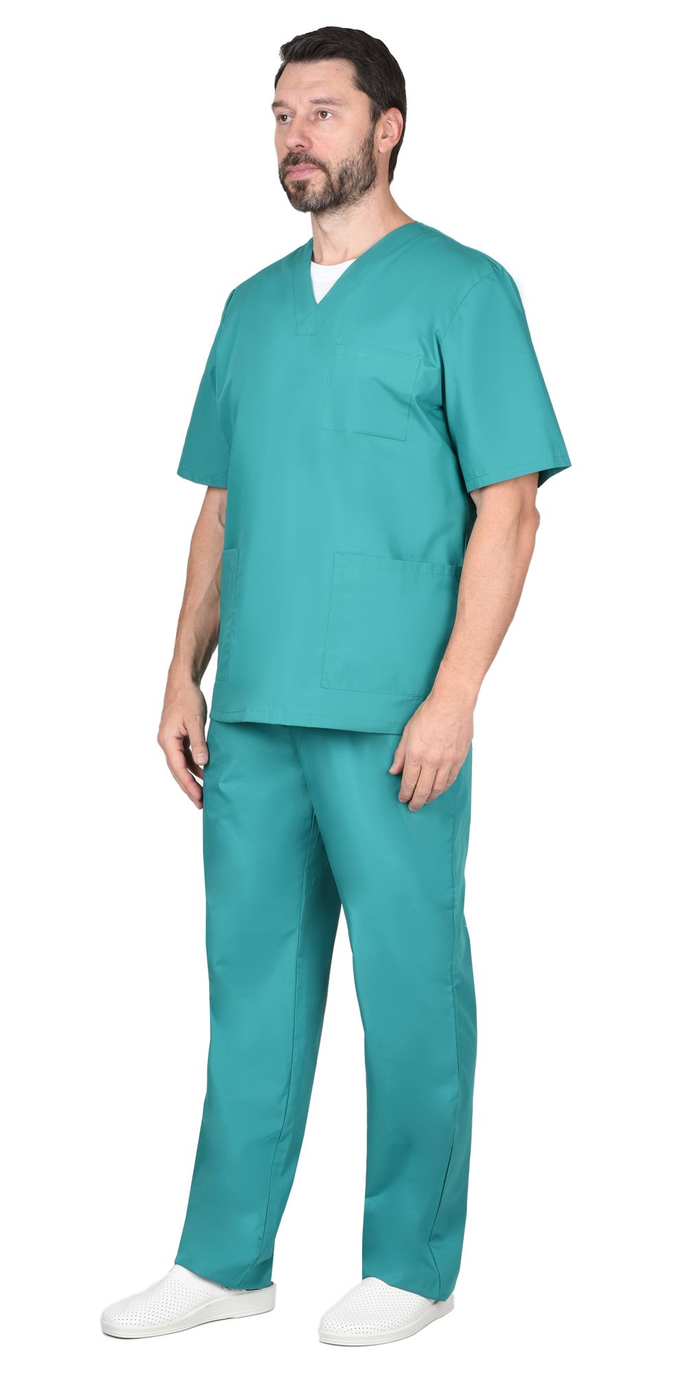 Универсальный комплект профессионального хирурга – блуза, брюки. Покрой свободный. Прямая блуза без пояса и без застёжки, рукава до локтей. У горловины вырез треугольный. Есть пара больших боковых накладных карманов и один накладной на груди. Брючины прямые, пояс брюк на резинке.