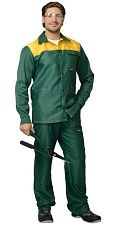 Мужской костюм состоит из куртки и брюк. Кокетка на куртке отделана материалом контрастного цвета. По низу кокетки настрочена светоотражающая полоса. Застёжка на пяти пуговицах расположена по центру. Воротник – отложной. На передней части куртки имеются накладные карманы, из них один на груди, два других боковые. Рукава снабжены манжетами и налокотниками, пуговичной застёжкой. Брюки — прямые, с пришитым поясом и пуговичной застёжкой. Оснащены наколенниками и парой накладных косых карманов.