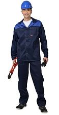 Мужской костюм с курткой и брюками. Двойная декоративная строчка. Отделка светло-серая на куртке – на кокетке переда. Нижний срез кокетки с красным кантом. Красные вставки на центральной планке, на нагрудном кармане и рядом с манжетами рукавов. Куртка короткая, застёжка-молния по центру, скрытая. На спинке вертикальные складки. Отложной воротник. Карманы: в вертикальных швах и накладные на груди (с клапанами). Брюки прямые, с застёжкой-молнией и на пуговице, пояс регулируется по бокам хлястиками на липучках. Имеются два боковых кармана (вход фигурный), два задних для инструмента.